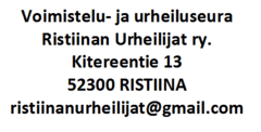 Ristiinan Urheilijoiden ja Ristiinan yu-mestaruuskilpailut su 7.9 klo 11 1.9.2025 Ristiinan urheilukentällä. Sarjat ja lajit: T/P 5, T/P 7 pallonheitto, juoksu 40 m, pituus. T/P 9, T/P 11, T/P13 kuula, pituus, 60 m. T/P 15-M/N kuula , pituus, 100 m. Ilmoittautuminen ennakkoon kirsi.olkkonen@outlook.com tai urheilukentällä 10.00-10.30. TULOKSET