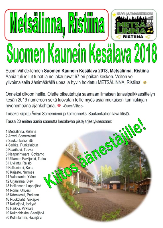 SuomiViihde-lehden Suomen Kaunein Kesälava 2018 -lukijaäänestyksen äänet on saatu viimeinkin laskettua. Ääniä tuli reilut tuhat ja ne jakautuvat 67 eri paikan kesken. Voiton vei ylivoimaisella äänimäärällä upea ja hyvin hoidettu METSÄLINNA, Ristiina! :D https://www.facebook.com/Suomiviihde SuomiViihde |