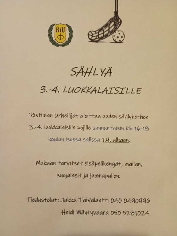 Ristiinan Urheilijat aloittaa uuden sählykerhon 3.-4. luokkalaisille pojille sunnuntaisin klo 16-18 koulun isossa salissa 1.9.2024 alkaen.