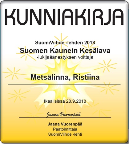 SuomiViihde-lehden Suomen Kaunein Kesälavaksi 2018 on äänestetty Metsälinna, Ristiina.