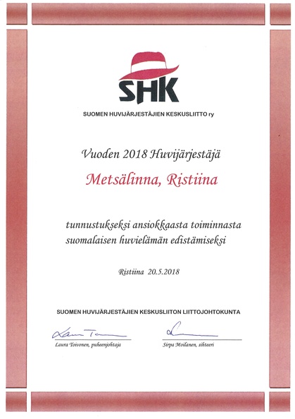 RISTIINAN METSÄLINNA v. 2018 HUVIJÄRJESTÄJÄ 21.5.2018 Suomen Huvijärjestäjien keskusliitto palkitsi Ristiinan Metsälinnan 20.5.2018 kokouksessaan Metsälinnassa vuoden 2018 Huvijärjestäjäksi. Perusteina pitkäjänteinen työ tanssikulttuurin edistämiseksi sekä laajat investoinnit Metsälinnaan. |